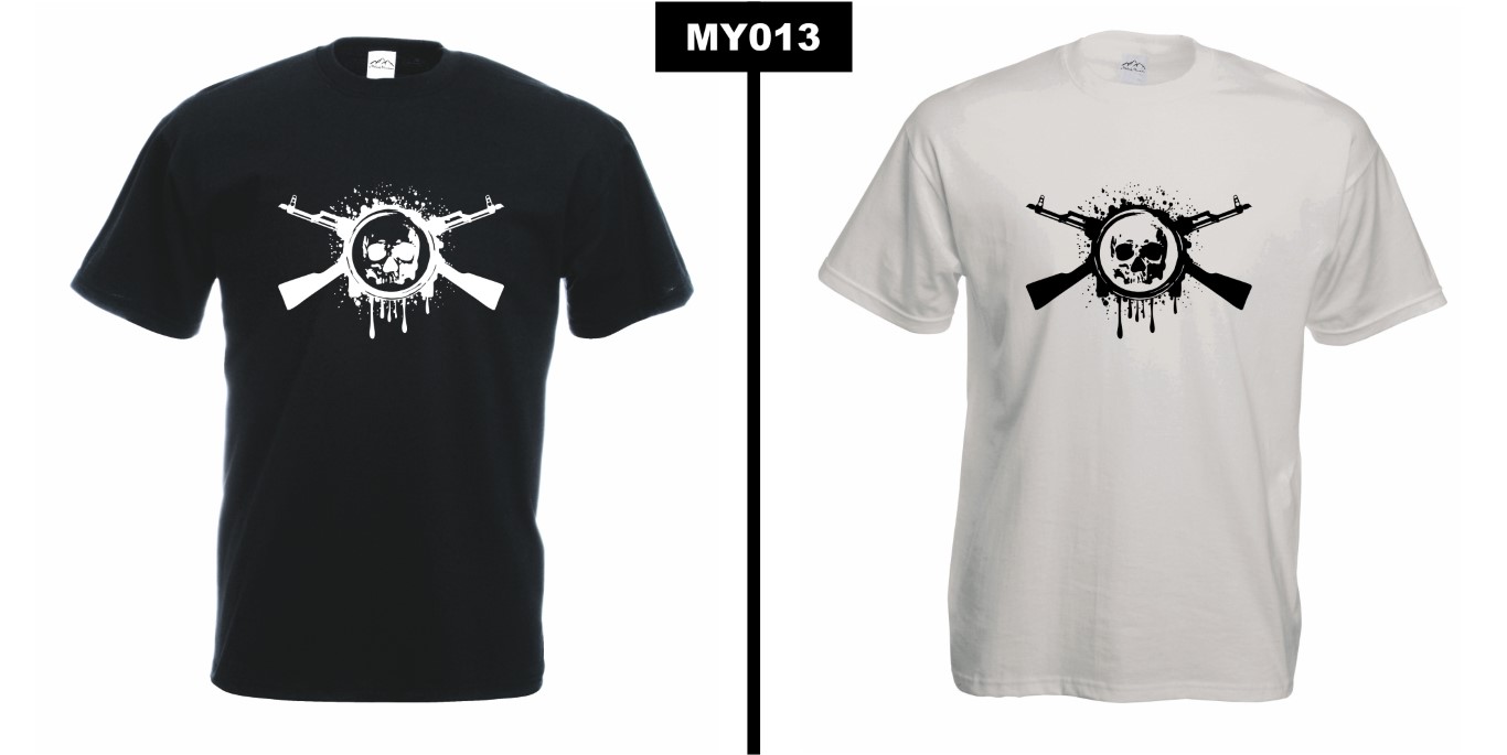 Koszulka „Czaszka i Karabiny” to propozycja dla osób, które cenią sobie militarną symbolikę i mocne, wyraziste wzory. Grafika przedstawiająca czaszkę otoczoną dwoma karabinami i splatterowym tłem jest idealnym akcentem dla tych, którzy nie boją się wyróżniać.