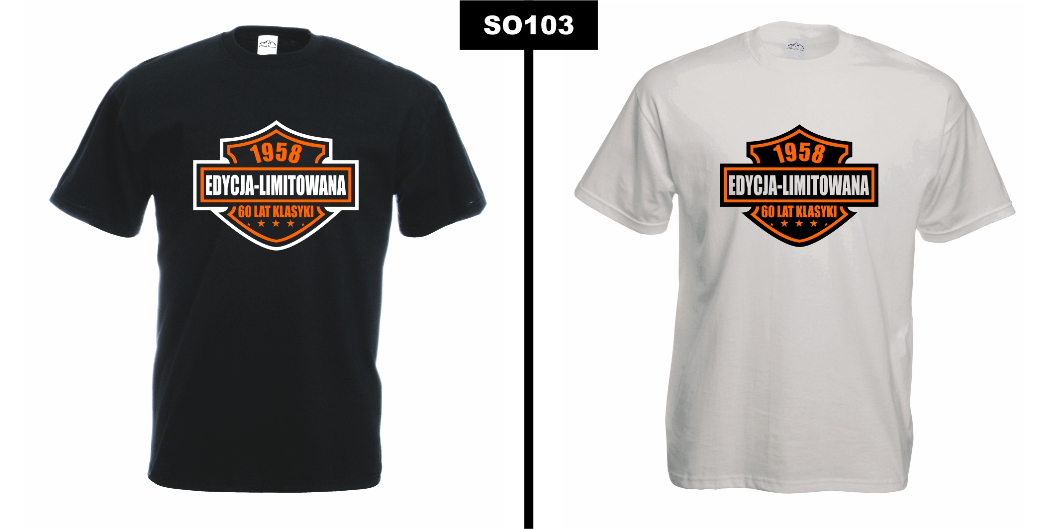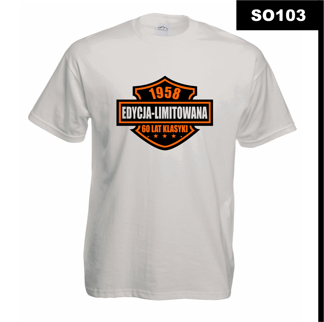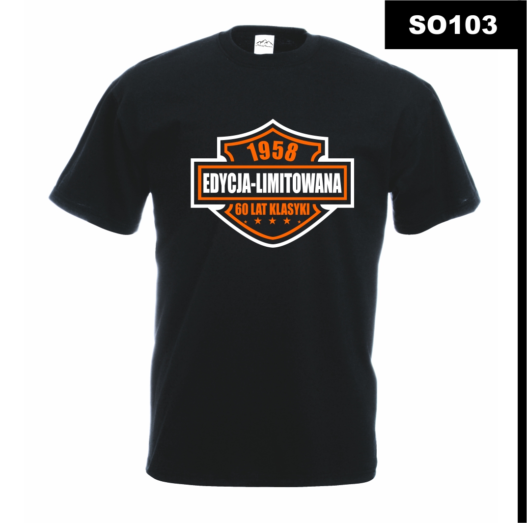 Projekt inspirowany motywami motoryzacyjnymi i klasycznymi emblematami. Kolorystyka czerni i pomarańczu przyciąga wzrok i dodaje całości dynamicznego charakteru. To koszulka, która jednoznacznie mówi: „Jestem wyjątkowy, bo pochodzę z najlepszej epoki!”