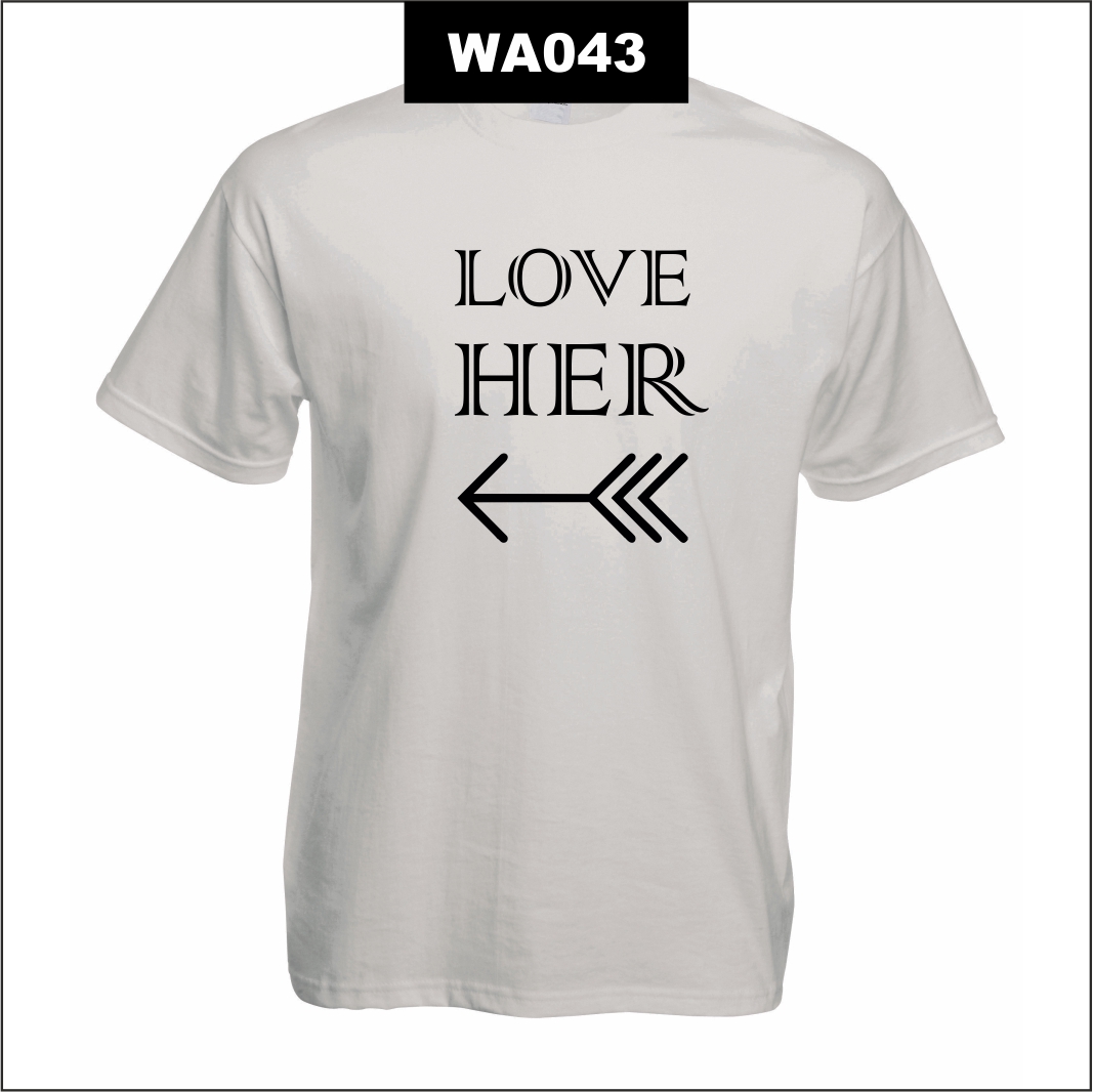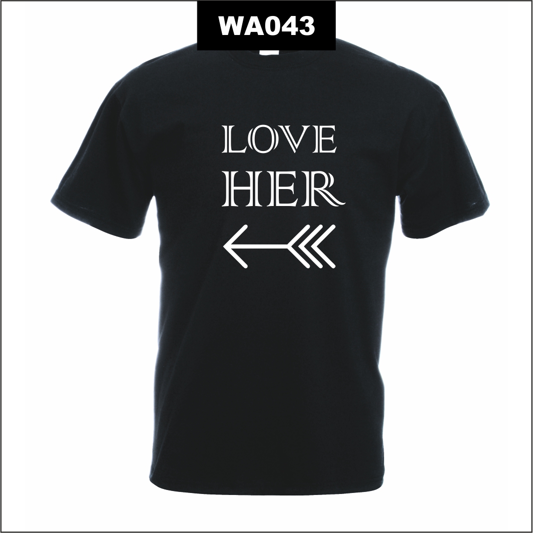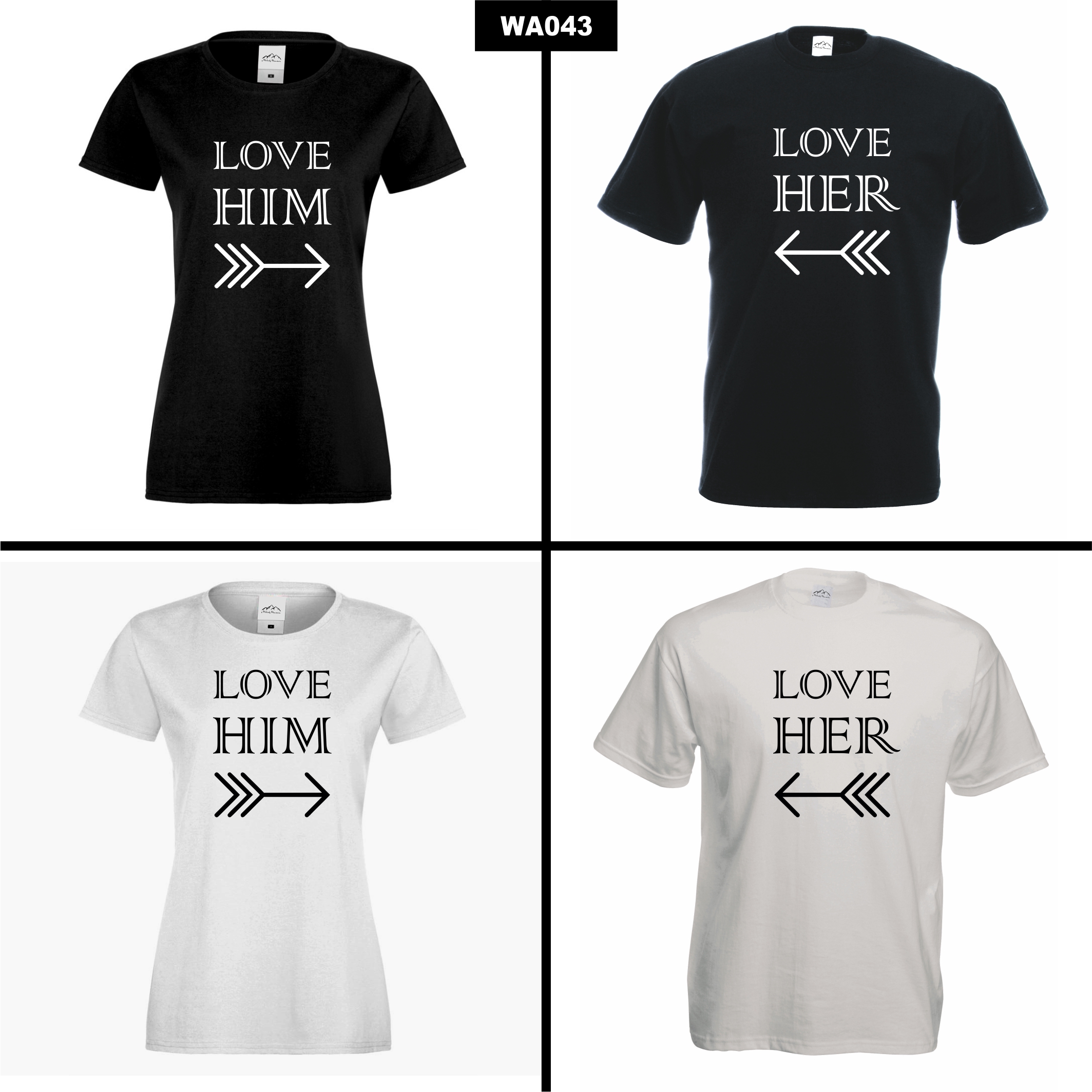 Prosty, a zarazem efektowny design z napisem „Love Him” i „Love Her” oraz strzałką wskazującą na partnera sprawia, że koszulki świetnie prezentują się razem. Klasyczna czarno-biała kolorystyka pasuje do każdej stylizacji i okazji.
