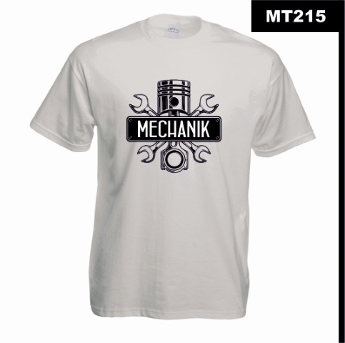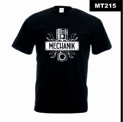 Centralnym elementem nadruku jest tłok silnikowy otoczony kluczami – symbol wytrwałości i umiejętności mechanika. Kontrastowa czarno-biała grafika w stylu industrialnym nadaje koszulce surowego, warsztatowego charakteru.