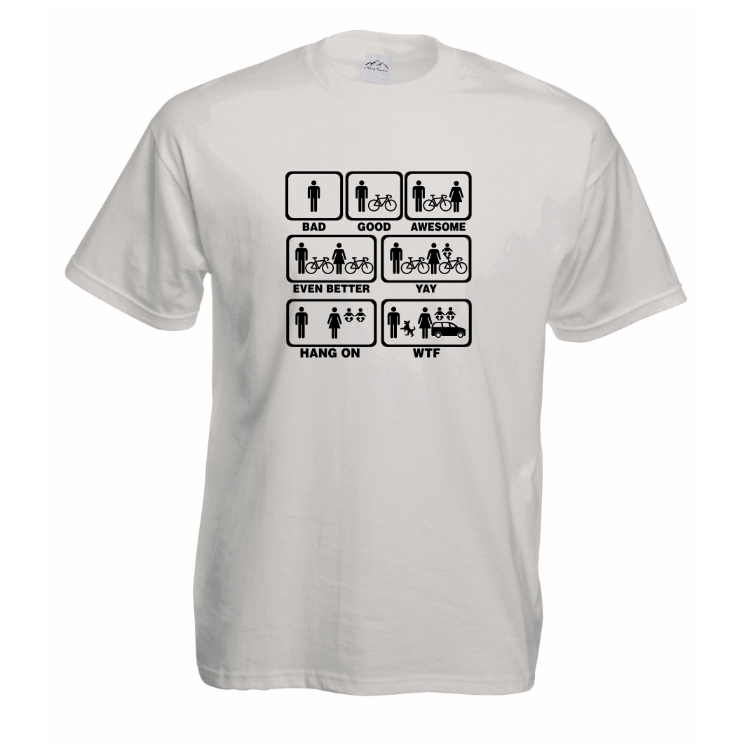 Koszulka „Plan Życia” przedstawia różne etapy rowerowych przygód w humorystycznej formie. Od „Bad” po „WTF” – każdy poziom to obrazek, który oddaje specyfikę jazdy na dwóch kółkach. To idealna koszulka dla każdego, kto kocha rowery i potrafi spojrzeć na swoją pasję z dystansem i humorem.