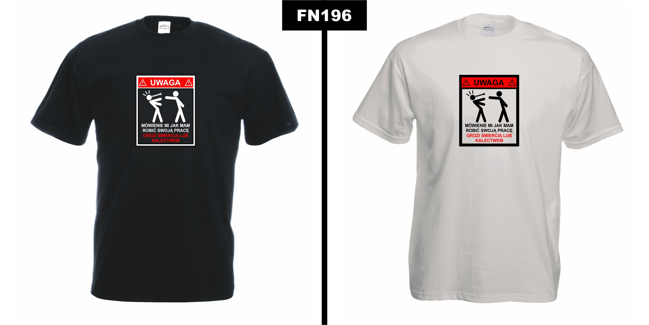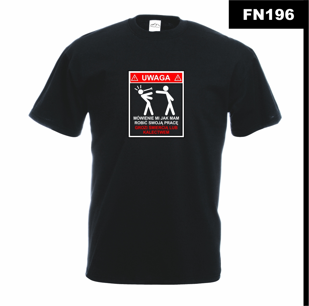 Projekt bazuje na dobrze znanych znakach BHP – wyraźny napis „Uwaga” oraz prosta, ale sugestywna grafika sprawiają, że koszulka przyciąga wzrok i wywołuje uśmiech. Czarno-czerwony nadruk na białym tle podkreśla efekt ostrzeżenia.